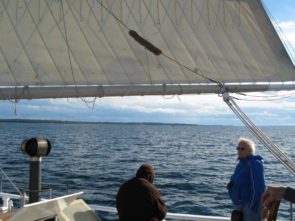 Besides 6 sails, the Manitou has a diesel engine and we motored away from the dock. After a bit Captain Dave headed the Manitou into the wind to begin the process of raising the sails. The crew got at least 6 of us passengers lined on either side of the deck forward of the main mast to raise the mainsail. The Manitou is a gaff-rigged schooner in that its main and fore sails are trapezoidal in shape being stretched between the boom on the bottom and the gaff at the top. The port line raised the throat of the gaff next to the mast, while the line on the starboard side raised the peak of the gaff. I was on the port side when the time cane our side shouted to the captain “Ready on the throat!” The other side shouted “Ready on the peak!” At the signal we hauled away. As we were raising more and more canvas the task grew harder. Near the end we end we gave some mighty pulls with commands of 2-6-Heave.