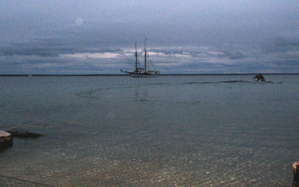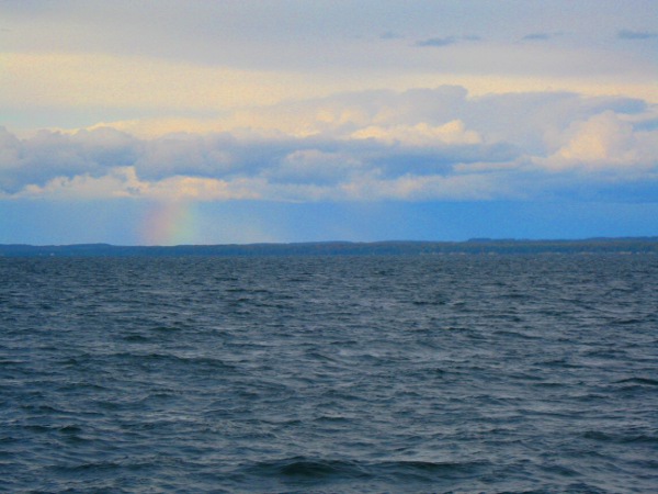 Toward the end of our sail that day we saw a rainbow in the distance. It was truncated because it was in the distance and the clouds were low. After we anchored in Old Mission Bay we had dinner and the Zodiac boat was lowered from the davits at the stern of the Manitou to let those who wanted to go ashore.
