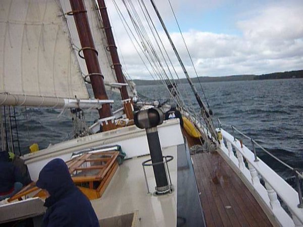 Getting the anchor up, keeping it from scraping the hull, and lashing it to the rail was quite an undertaking. Soon we were heading out of the harbor and into East Bay into the brunt of the wind and waves.