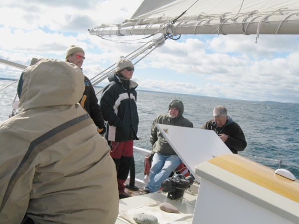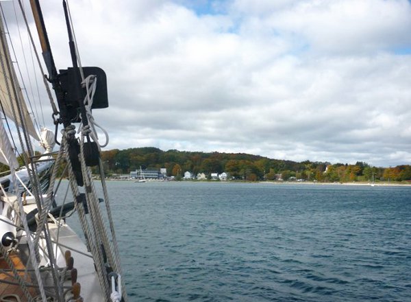 It was a very rough time. With a north wind, what took an hour to pass the Old Mission Light and sail into Old Mission Harbor, took half the day to get back around the light, tacking against the wind. Captain Dave said that the boat could only head 60 degrees into the wind. On top of that the wind seemed to be pushing us back. We’d start to tack toward the light with it to the port side of the bow, and before long the light had drifted to the starboard side.