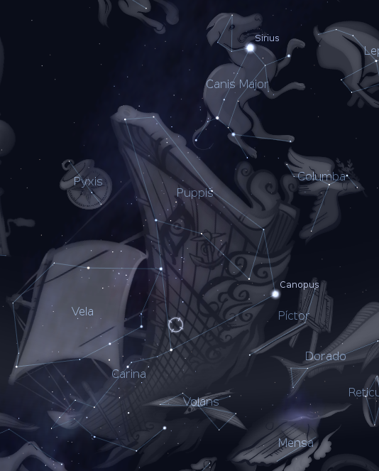 Located south and east of Canis Major, the great hunting dog of Orion and it brilliant star Sirius in the south is a dim constellation of Puppis, the poop deck of the old constellation Argo Navis, the constellation that depicts the ship Jason and the Argonauts used in their search for the Golden Fleece. This huge constellation has been subdivided. Only Puppis and Pyxis the ship’s compass are visible from Michigan. The rest of the ship are Carina the keel, and Vela the sail require traveling south at least to the southern United States. Three other constellations also related to this expedition are Gemini with Castor, who died on the expedition and Pollux. Hercules was also aboard and was the physician of the constellation Ophiuchus.