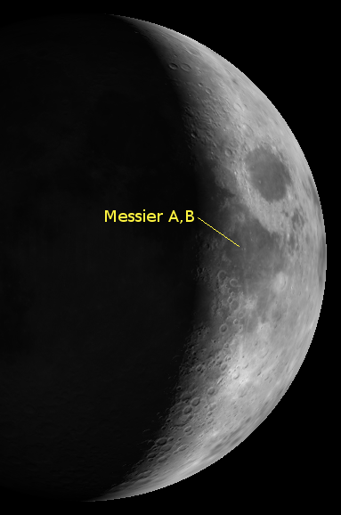 The moon tonight is a fat crescent with the small circular Sea of Crises visible near the upper edge. Below that is the larger Sea of Fertility. In a small telescope a double light streak will be visible on the floor of Fertility. At the head of the streaks are two small odd shaped craters named Messier A and B. Named after Charles Messier, comet hunter, and creator of the Messier catalog of some of the best deep sky objects for the amateur astronomer. Anyway, the craters though small are distinctive and relatively new, less than a billion years ago. The pair of small asteroids that hit the moon did so at a low angle to cause the spray of material to form those linear streaks. A most interesting feature to explore on the moon,