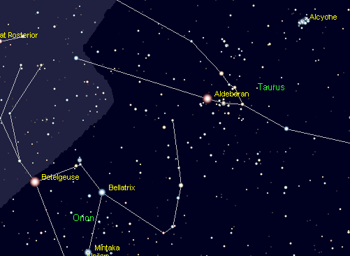 To the upper right of the constellation Orion in the south in the evening is a letter V of stars with a bright orange star at one tip. This is the face of Taurus the bull. In some constellation depictions the bull is charging Orion who is turned to face him. The V of stars isn’t very bright and are outshone by the Pleiades star cluster to the right in Taurus’ shoulder. In Greek mythology the V of stars are the Hyades, half sisters of the Pleiades. It is a star cluster like the Pleiades and very important, because it is the closest star cluster to us at 153 light years distant. It helped determine the scale of the universe. The bright star at the tip is Aldebaran the follower (of the Pleiades). It is not part of the Hyades and is less than half way to it at 65 light years.