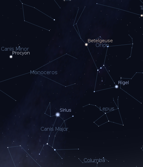 The bright star shining so bright low in the south southeast at 9 p.m. is Sirius the Dog Star. I talked about it Friday in the context of its constellation Canis Major, Orion’s larger hunting dog. Sirius itself is a remarkable star. It’s name means dazzling one and a look at it in binoculars or a telescope will prove it.. The twinkling effects are due to the earth’s atmosphere, but the bright arc light color is all his. Sirius is a perfect white star. Compare it with the brightest star now overhead Capella which has the same color as our sun. Star colors tell us the temperature of the star surfaces, which run from cool red to hot blue. On our Fahrenheit temperature scale, the sun’s surface is about 10,000 degrees, Sirius is nearly twice that.