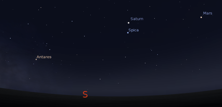 A rival to Mars is now low in southeast at 10:30. It is the red star Antares, whose names literally means “Rival of Mars”. This is from the Greek who’s god of war was Ares. Mars is in the southwest now and a bit brighter than Antares. When Mars catches up with Antares around October 20th this year, they will be nearly the same brightness, and one would be hard put to tell them apart. Antares is in the heart of Scorpius the scorpion which lies close to our southern horizon later in the evening, and is best seen next month at an earlier time. Antares is also a star that appears strange as its twinkling is very pronounced being always close to the horizon for us sputtering all the colors of the rainbow.