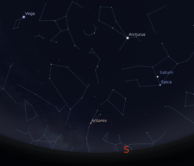 Since it’s Flag Day, lets look for some red white and blue stars. Red is easy, I talked about it Tuesday, It is Antares now low in the southeast in the evening in the heart of the constellation of Scorpius the scorpion. For the white star there is no purer white star than Vega, spectral type A0 (A zero), the astronomers definition of white. It is located midway up the sky in the east. It is the 5th brightest night time star, and is seen off a small parallelogram of stars that make up the body of Lyra the harp. For the blue star, the best is Spica, below Saturn this year and in the south in the evening. It is the bluest of the 21 brightest first magnitude stars. Color in stars is often subtle, so try to see these colors.