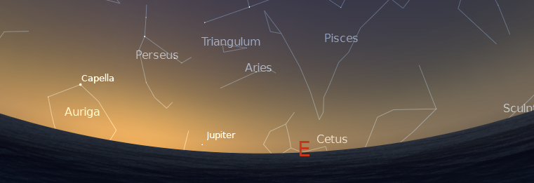 Jupiter rising a bit right of East at 5 a.m. Venus will rise at 5:18 on the 14th. We should see them both next week. Click to enlarge.