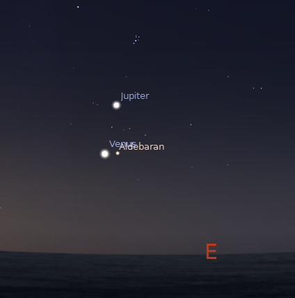 Note Aldebaran near Venus. Aldebaran is the brightest star in the winter constellation Taurus the bull. Note the Pleiades star cluster above Jupiter. Well worth a look with binoculars.