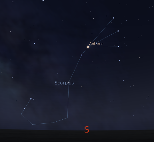 Crawling just above the southern horizon at 11 p.m. is the zodiacal constellation of Scorpius the scorpion. His heart is the red giant star Antares. Its facing the west or right with a short arc of three stars as its head. His body and tail drop to the left and scrape the horizon before curving up to the critter’s poisonous stinger of two stars. One story of the scorpion concerns Orion the hunter the great winter constellation. In that story Orion was supposedly killed by the sting of a scorpion. Therefore Orion and Scorpius are never seen in the sky at the same time. That is certainly true around here and for the Greeks, whose legend it is. However if one travels far enough south that is no longer true.
