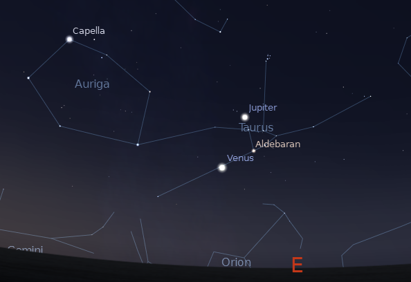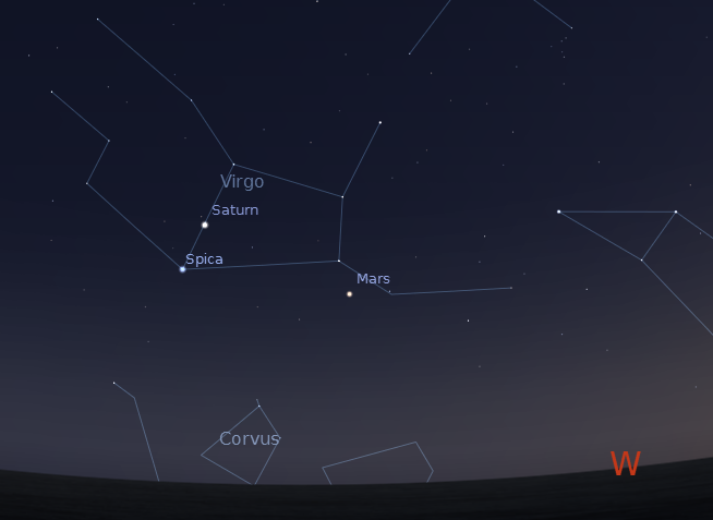 Let’s see what’s happening with the bright planets for this week. Mars, with its unmistakable bright reddish color, is in the west southwest in the evening in the constellation of Virgo the virgin. Mars will be setting in the west at 12:14 a.m. It is approaching Saturn and Spica just to its left. Saturn will be in the southwest above the bright star Spica now. It will set at 12:59 a.m. Jupiter, now a morning planet will rise at 2:45 a.m. in the east northeast. Venus, is now seen just below Jupiter after it rises at 3:31 a.m. Tomorrow morning, the bright star Aldebaran will appear between the two before twilight gets too bright before 5 a.m. All these planets except Mars, which is too small, are great to view in a telescope.