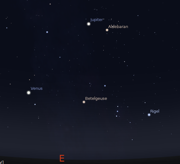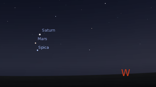Let’s see what’s happening with the bright planets for this week. Mars Saturn and the star Spica make a bright skinny triangle in the west southwest after sunset. Mars is in the middle between Saturn on the top and Spica. They are located in the constellation Virgo the virgin. Mars will be setting in the west at 10:59 p.m. Saturn will set at 11:12. The triangle is going to fatten up over the next week as Mars heads eastward. The morning sky features the two brightest planets: Jupiter, which will rise at 1:12 a.m. in the east northeast and Venus, which will rise at 3:08 also in the east northeast. The bright star Aldebaran in Taurus the bull will appear just to the lower right of Jupiter tomorrow morning, but Venus will be at greatest elongation from the sun.
