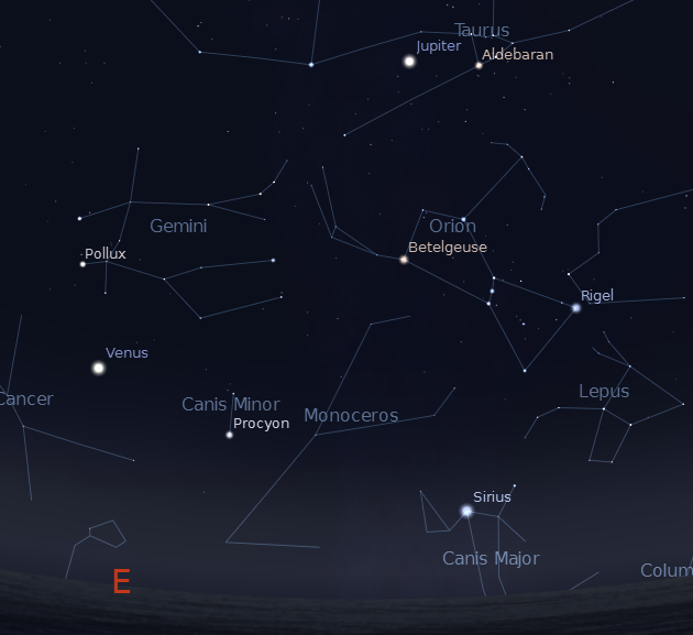 Let’s see how many bright planets we can find this week. Mars, Saturn and the star Spica make an elongated triangle in the west southwest in twilight after sunset. Mars is on the left with Saturn on the upper right and Spica below. Spica will set first at 9:24 followed by Saturn at 9:57 and Mars at 10:07. This will be about the last week you’ll see Saturn and Spica in the evening until next year.. The morning sky features the two brightest planets: Jupiter, which will rise at 11:54 p.m. in the east northeast and Venus, which will rise at 3:23 a.m. also in the east northeast. Jupiter is near the head of Taurus the bull, while Venus is moving between Gemini and Cancer.
