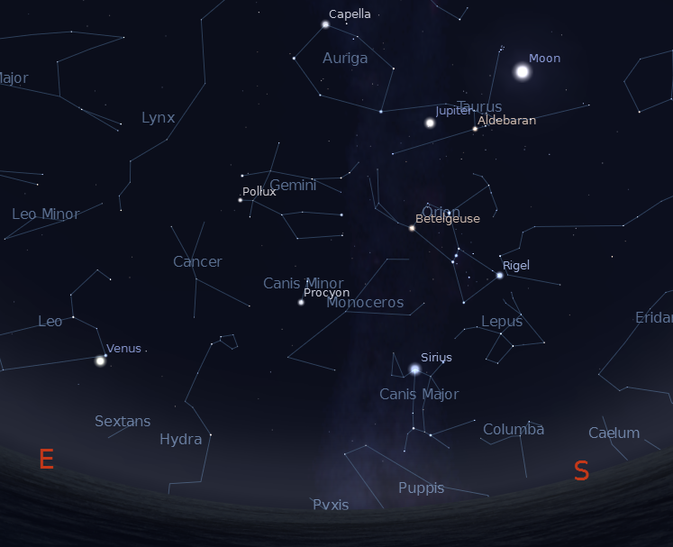 Let’s see how many bright planets we can find this week. Mars and Saturn now set too close to the sun to be easily seen in the evening sky. Both are in the west southwestern sky and very low in twilight. Saturn sets at 8:10 p.m., while Mars sets at 9:08. The planetary action moves to later in the evening and the morning. Jupiter, will rise at 10:09 p.m. in the east northeast. It is located in the constellation of Taurus. The last bright planet of the night is the morning star Venus which will rise at 4:13 a.m. also in the east northeast. Venus is now in Leo outshining the star Regulus next to it. The planets Venus and Jupiter and the winter constellations are a great sight for early risers. You can enjoy them without danger of frost bite.