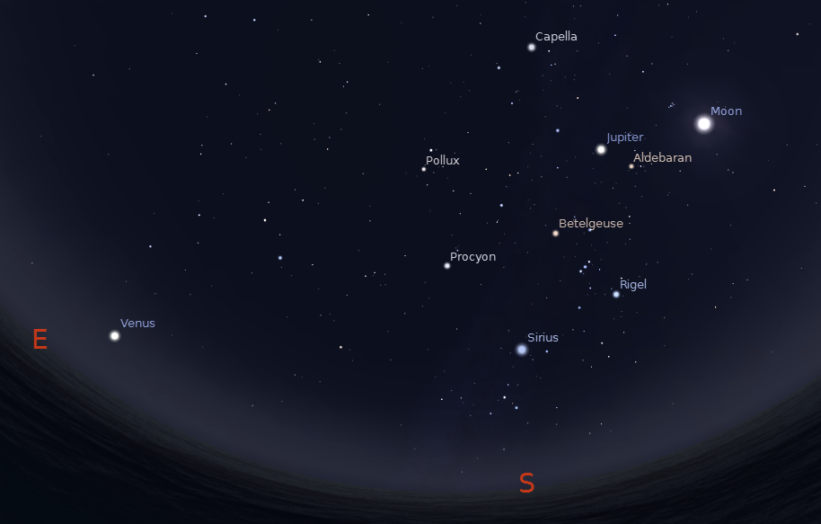 Let’s check out the planets for this week, a day early. At 7:30 p.m. Mars can be seen low in the southwest moving away from the red star Antares, whose name means rival of Mars. Mars will set at 8:26. The planetary action will have already picked up on the other side of the sky. Jupiter, will rise at 8:18 p.m. in the east northeast. It is located in the constellation of Taurus. It will transit or pass due south at 3:54 a.m. The last bright planet of the night is the morning star Venus which will rise at 5:16 a.m. also in the east. Venus is now below the hind end of Leo, and entering the constellation of Virgo. The planets Venus and Jupiter and the winter constellations are a great sight for early risers. It’s starting to feel like winter in the early morning.