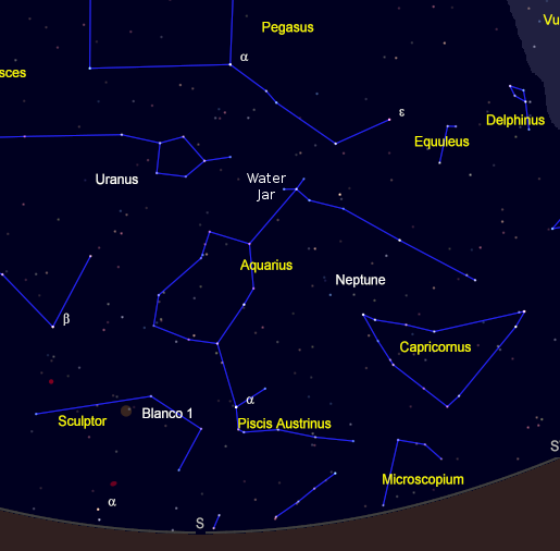 One of the constellations of the zodiac is in the south sky at 9 in the evening. It’s the constellation of Aquarius the water bearer. The image that is supposed to be depicted in the stars is that of a hapless fellow spilling a stone jar of water across the sky. Aquarius is fairly hard to spot because it is made of faint stars. One part of him, though, is easy to spot. That is the Water Jar, an asterism or informal constellation. It is a distinctive small nearly equilateral triangle of stars with another star in the center. Stars extending to the right from the water jar are that stream of water. The Water Jar is just below the top of the head of the upside down Pegasus the flying horse. The body of Aquarius is below, a misshapen deflated balloon of stars.