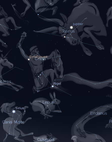 Orion, the central winter constellation is seen in the southern sky this evening. He is a hunter, as artists depict him, he is preoccupied with the charge of Taurus the bull from the upper right. At Orion’s feet, and unnoticed by him is the small constellation of Lepus the hare. It’s very hard to see a rabbit in its eight dim stars: however, I can see a rabbit’s head ears and shoulders. A misshapen box is the head and face of this critter facing to the left. His ears extend upwards from the upper right star of the box, and the bend forward a bit. Two stars to the right of the box and a bit fart
