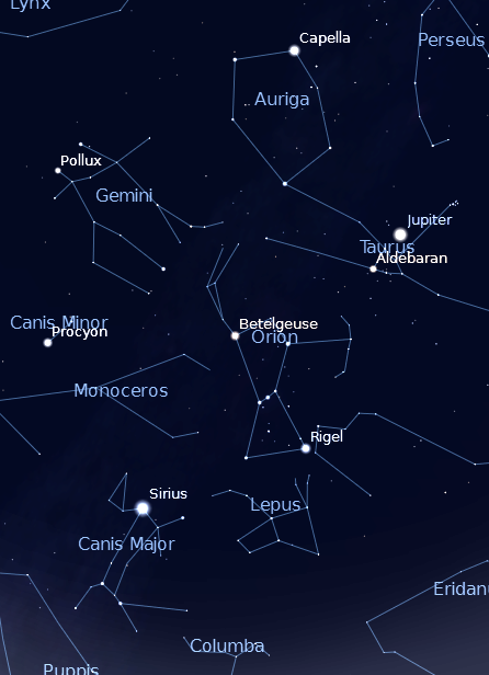 The constellation Orion has two hunting dogs. We’ve seen Canis Major the greater dog at Orion’s feet with Sirius in its heart. The lesser dog, Canis Minor iS level with Betelgeuse in Orion’s shoulder and off to the left. Just two stars mark it. Is it a dachshund or maybe a hot dog? It’s brighter star’s name is Procyon which means “Before the dog”, an odd title. It means that though east of Sirius, it rises before Sirius, due to its more northerly position in the sky. In many ways Procyon is nearly a twin of Sirius. It shines with the same white color, although a bit cooler, and has a white dwarf companion like Sirius. It’s a bit farther away than Sirius 8 light years. Procyon is at a distance of 11.46 light years. Procyon, Betelgeuse and Sirius make the winter triangle.