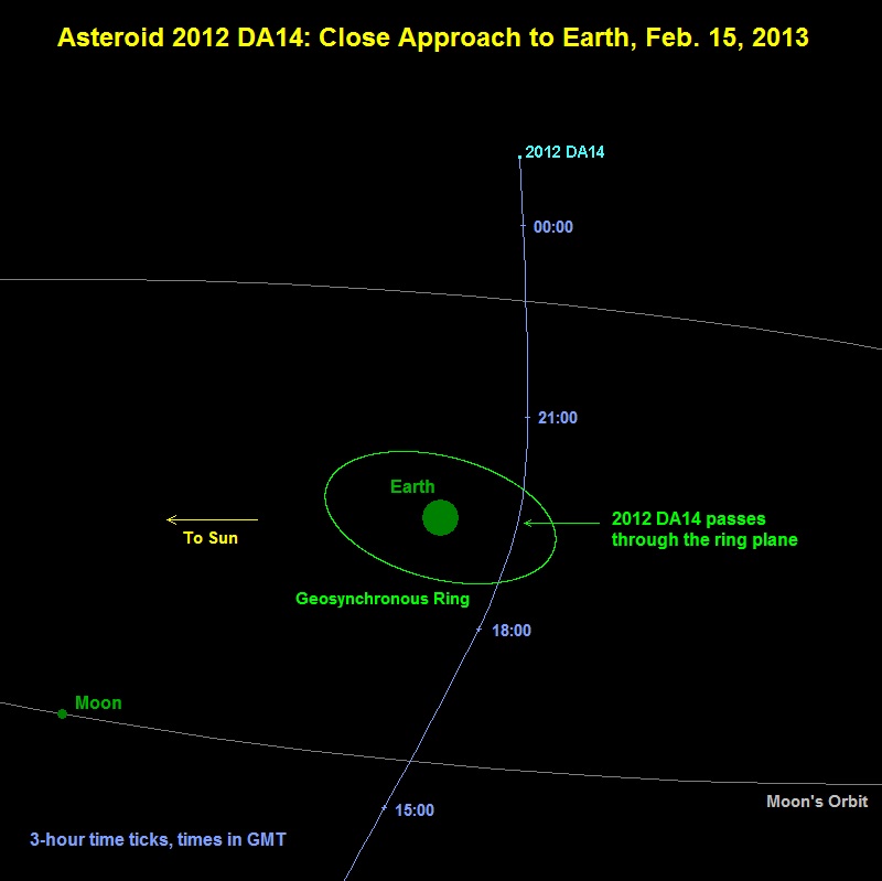 As it passes the earth the asteroid 2012 DA14 will appear to travel just about directly south to north. This because we are orbiting the sun too. Until the encounter the asteroid has a slightly slower orbit of the sun. The encounter will cause the orbital period of the asteroid to shorten. The asteroid will cross this point in the solar system again, and someday the asteroid and the earth will cross each other’s path again on or around February 15th in a distant year.