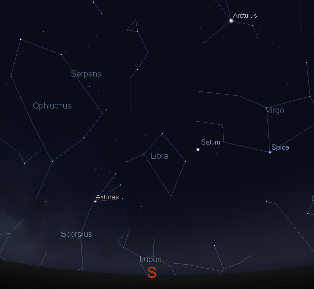 Saturn and the coming stars of late spring and early summer at 6 a.m. on February 21, 2013. Created using Stellarium 0.12.0.