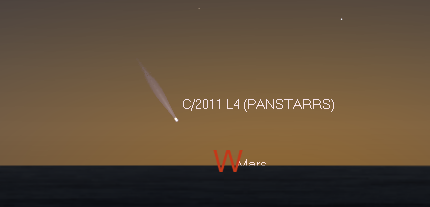Comet PanSTARRS is now officially in our skies. It may be visible very low on the western horizon about 45 minutes after sunset. That will make it about 8:30 p.m. The head of the comet may make it to second magnitude, about as bright as a Big Dipper star. The tail should point nearly straight up. As the days go by the tail will lean to the right and the comet moves northward. Tomorrow night the comet will be just left of the thin crescent moon. Pictures of the comet can be found at spaceweather.com, from earlier this month. PanSTARRS or Comet 2011 L4, as its official designation goes will probably not return. It came in reasonably near the plane of the solar system, but is leaving far to the north. Binoculars are the tool best used to spot it.