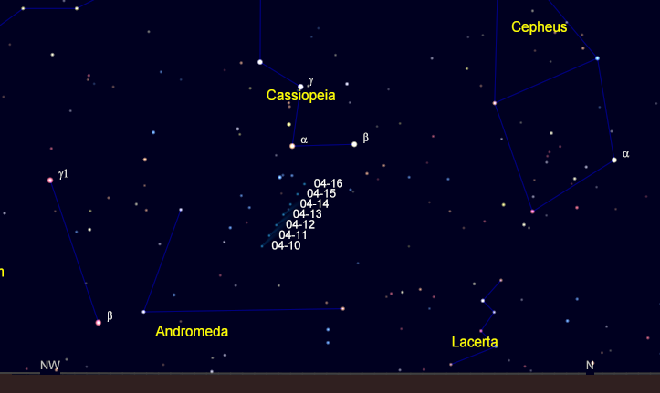 Comet PanSTARRS at the end of twilight at 10 p.m. for the seven days starting April 10, 2013. Created using Cartes du Ciel.