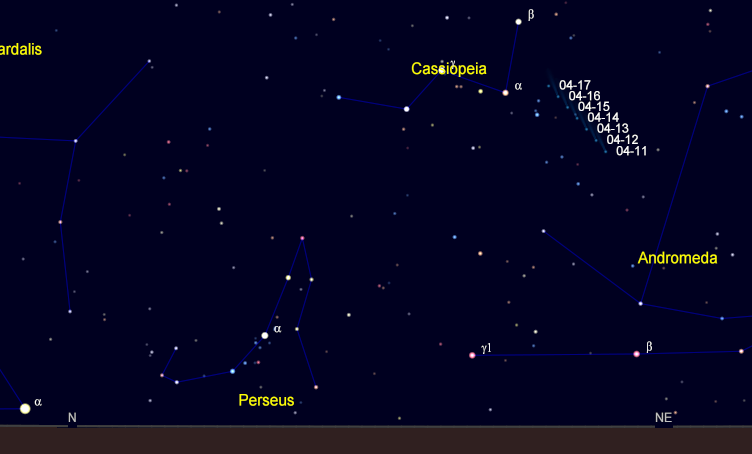 Comet PanSTARRS at the beginning of twilight 5:20 a.m. for the dates listed. Created using Cartes du Ciel.
