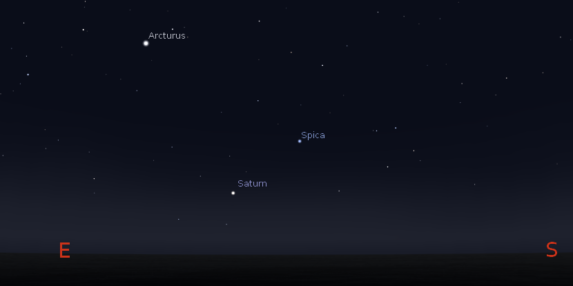 It’s time to check out a comet and the two remaining bright planets for this week. Comet PanSTARRS is in the northwest in the evening, moving away from the sun and us, and getting a little higher in the sky as it moves northward. The comet will no longer set though it is best seen in the evening and mornings just after the end of evening twilight and before morning twilight. The comet is now down to near 6th magnitude, strictly a binocular object. Jupiter is located in the constellation of Taurus and is in the west during the evening. It will set at 12:51 a.m. The other bright planet Saturn will rise at 9:43 p.m. in the east southeast. It’s located in eastern Virgo. It will pass due south at 2:56 a.m. Both planets are wonderful sights in telescopes. Saturn has those wonderful rings.