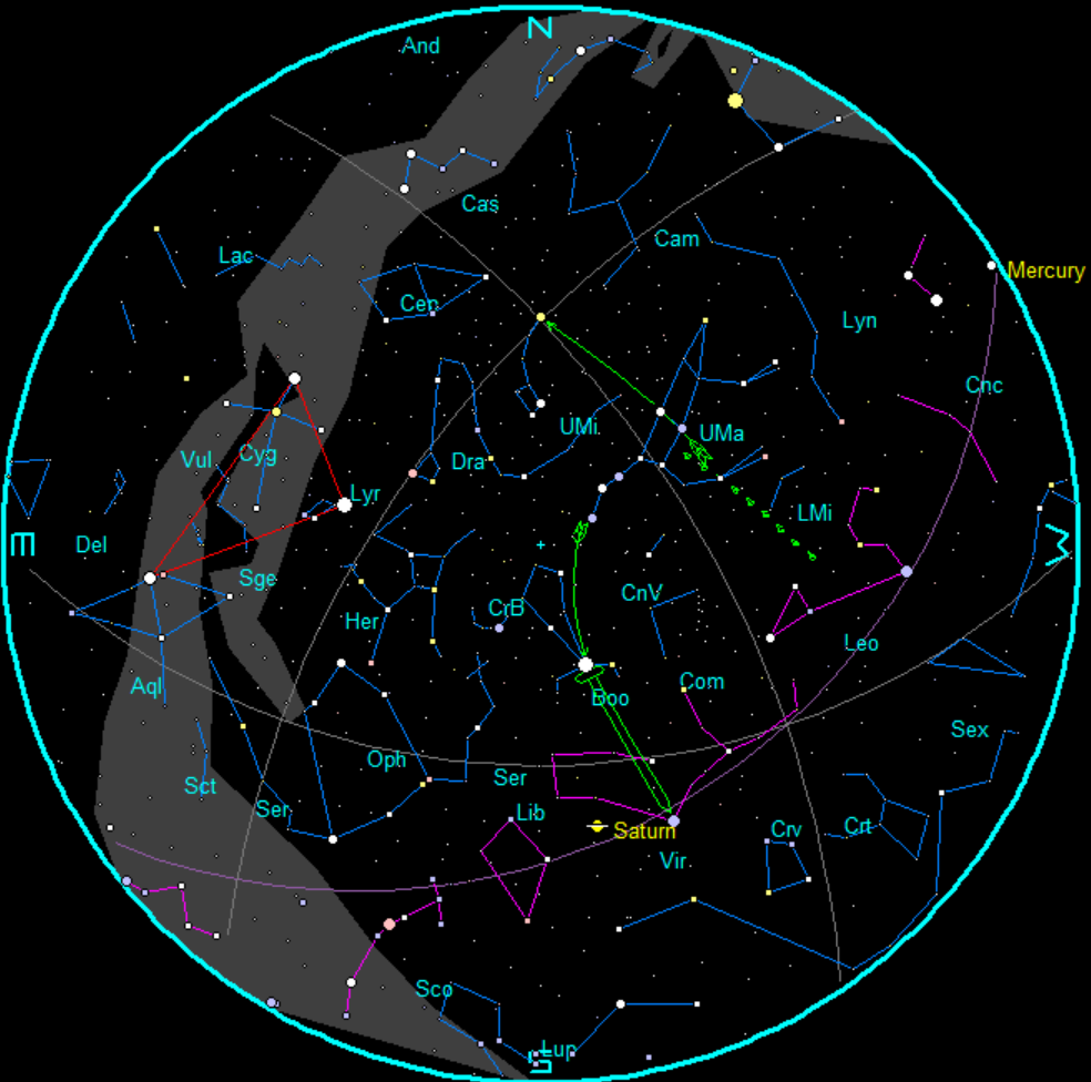 Appearing high in the southeastern sky at 10:30 tonight is the kite shaped constellation of Boötes the herdsman. The bright star Arcturus is at the bottom of the kite, pointed to by the arc of the handle of the Big Dipper, overhead. In one story Boötes represents a young hunter named Arcas, son of Callisto, a beautiful young lady who had the misfortune of being loved by Zeus the chief Greek god. Zeus’ wife Hera, found out about it, and since she couldn’t punish Zeus, turned Callisto into an ugly bear. Arcas, unaware of why his mother disappeared in his youth was about to kill the bear when Zeus intervened and placed them both in the sky. Now Arcas as Boötes chases the Great Bear forever around the pole of the sky each day and night.