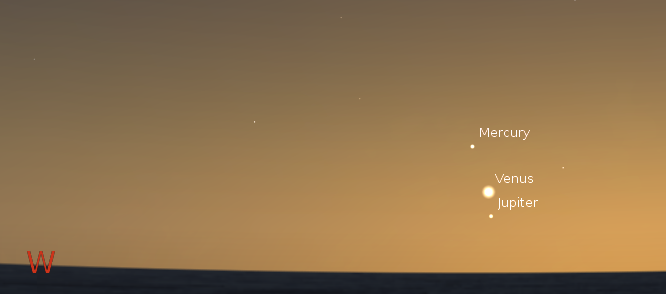 Lets take a look at the planet jam in the west after sunset. There’s a rather short period and a very low western horizon that will let you see them. Jupiter will be on top, with Venus just below and to its right. Mercury will be to Venus’ right and just a bit higher. The separation from Jupiter to Mercury is just under 6 degrees, a bit more than half the width of a fist held at arm’s length. It is generally true that the width of one fist held at arm’s length describes a ten degree angle in the sky, Kind of a rule of thumb, or in this case fist to help one gauge the sky with out a sextant or quadrant. Tomorrow the grouping will be getting even more compact. Reaching their most compact Sunday evening.