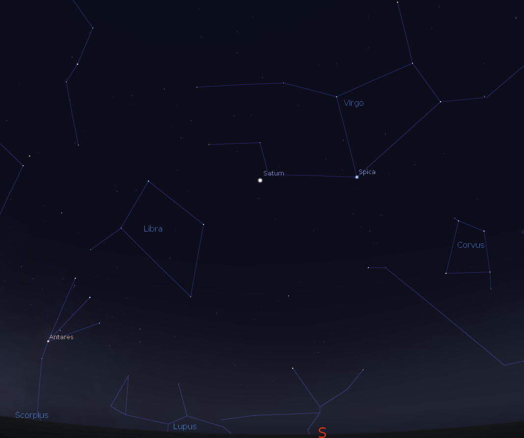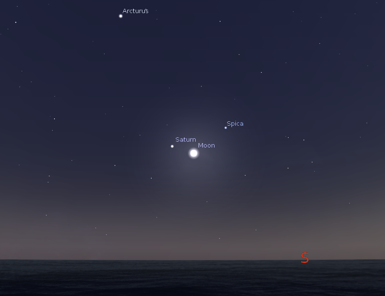 The early evening will be taken up with the grouping of Jupiter, Venus and Mercury low in the west northwest at about 10 p.m. Jupiter will be on top and the easiest to spot with Venus below and right of Jupiter and tiny Mercury off to its right. Mercury sets at 10:24 p.m., with Venus following a minute later, while Jupiter will set at 10:48. Hanging backing from this planetary grouping in the east southeast will be Saturn this evening, the brightest star-like object in the constellation Virgo appearing yellowish to the left of the extremely blue-white star Spica. Tonight Saturn will be to the left of and above the bright moon. Saturn will pass due south at midnight, and will set at 5:16 tomorrow morning.