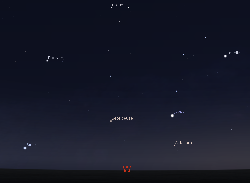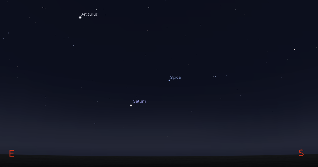 It’s time to check out the two remaining bright planets for this week. Jupiter is located in the constellation of Taurus, above the V shape of stars, the face of the bull and is in the west during the evening. It will set at 11:49 p. m. In the west northwest. Jupiter is still high enough as it gets dark to get a very good view of its cloud bands and satellites. The four moons that Galileo found are easy targets for small telescopes or even sharp eyed binocular observers. The other bright planet Saturn will be low in the east southeast when it gets dark in the evening. It’s located in eastern Virgo, but us moving back a bit toward the bright star Spica to its right. Saturn will move past due south at 1:28 a.m. An event called transiting the meridian.