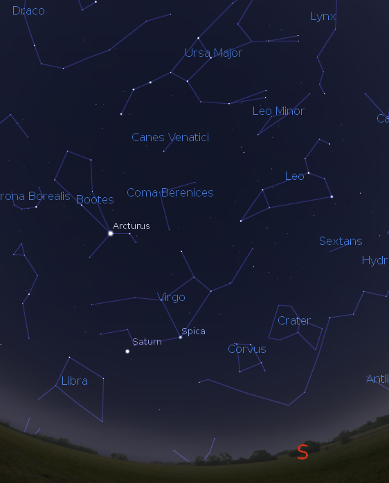 The Big Dipper, now pretty much overhead points to several stars and constellations. It’s handle points to two bright stars. First we follow the arc of the handle to the bright orange star Arcturus, the 4th brightest night time star. The reason I say night time is that the sun is a star also but by definition is not out at night. The arc to Arcturus is a how to find Arcturus and a clue to its name. Arcturus, high in the east southeast, lies at the base point of the kite shaped constellation of Boötes the herdsman. From Arcturus, straighten out the arc to a spike and one soon arrives at Spica a blue-white star in Virgo the virgin, now low in the southeast. Saturn is to its left this year. Spica is also sometimes pronounced “Speeka”.