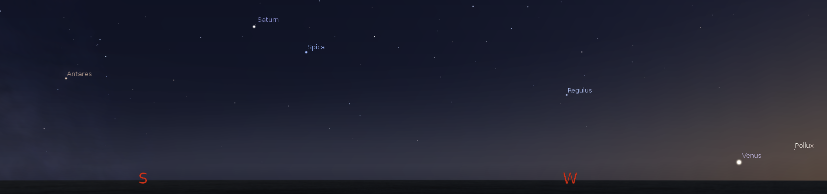 Venus is now all alone in the evening twilight low in the west northwest, Mercury having sunk closer to the sun. Venus will set at 11:05 p.m. Holding forth in the south southwest will be Saturn this evening, the brightest star-like object in the constellation Virgo appearing yellowish to the left of the extremely blue-white star Spica. Saturn is a wonderful sight in a telescope of 20 power or more. Saturn will pass due south at 9:36 p.m., and will set at 2:54 tomorrow morning. Jupiter and Mars are along with Mercury too close to the direction of the sun to be seen. I will cover Jupiter and Mars emerging into the morning sky late next month when they’ll appear together.