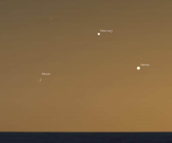 Tonight the moon will join Mercury and Venus low in the west northwest at around 10:15. Venus will be the easiest to spot. Mercury will be above Venus and to the left. Binoculars may help you spot it. The crescent moon will be to the left and a bit below Venus. If you’ve been watching these planets for the past two weeks you’ve probably noticed that Mercury is getting fainter. That’s because its phase is becoming less full as moves around the sun toward us. It’s phase is now a bit more than half illuminated. Wednesday it will be half illuminated as it reaches its greatest elongation from the sun, a whopping 24 degree angle from the sun. That’s pretty good for us observing from the northern hemisphere.