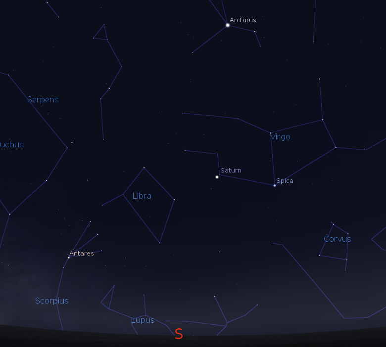 The early evening will be taken up with Venus and faint Mercury low in the west northwest at about 10:15 p.m. The crescent moon is nearby to the left. Mercury is above and left of Venus by about 5 degrees, about half the width of your fist at arm’s length. Mercury is at its greatest separation or elongation from the sun today of 24 degrees angle. Venus will set at 10:59, and Mercury will set at 11:14 p.m. Holding forth in the south will be Saturn this evening, the brightest star-like object in the constellation Virgo appearing yellowish to the left of the extremely blue-white star Spica. Saturn is a wonderful sight in a telescope of 20 power or more. Saturn will pass due south at 10:33 p.m., and will set at 3:51 tomorrow morning.