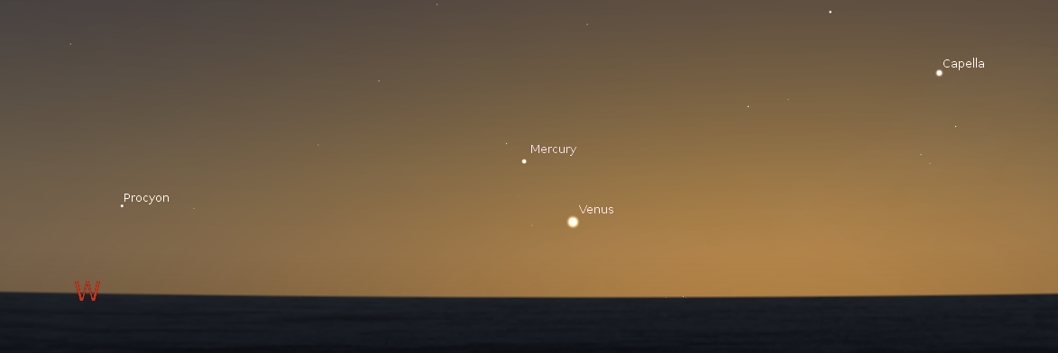 Tonight the moon will join Mercury and Venus low in the west northwest at around 10:15. Venus will be the easiest to spot. Mercury will be above Venus and to the left. Binoculars may help you spot it. The crescent moon will be to the left and a bit below Venus. If you’ve been watching these planets for the past two weeks you’ve probably noticed that Mercury is getting fainter. That’s because its phase is becoming less full as moves around the sun toward us. It’s phase is now a bit more than half illuminated. Wednesday it will be half illuminated as it reaches its greatest elongation from the sun, a whopping 24 degree angle from the sun. That’s pretty good for us observing from the northern hemisphere.