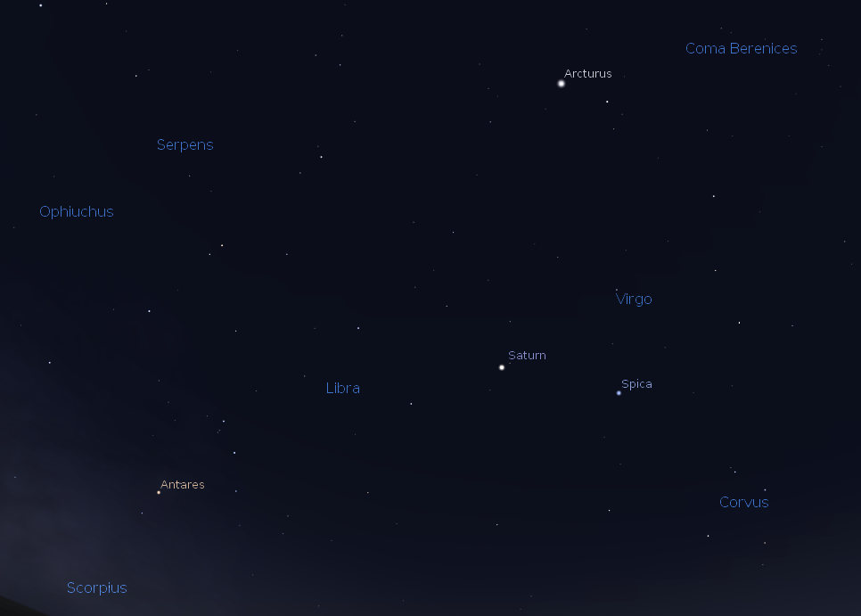 Star and planets colors are quite subtle. This is partly due to the fact that we are color blind at very low light levels. Only the brightest stars show color at all. Telescopes however aid our color perception because it makes the stars brighter. The planet Saturn, now in the south at night has a distinct yellowish hue, caused by the color of its atmosphere. The star Spica to its right is the bluest of the bright first magnitude stars, and shows as a bright arc light. Arcturus, above both Saturn and Spica has a yellow to orange hue. Antares low in the southeast has a definite reddish hue. In a telescope it also looks like a sparkler due to our turbulent atmosphere. Red stars are the coolest stars (temperature wise) while blue-white stars are the hottest.