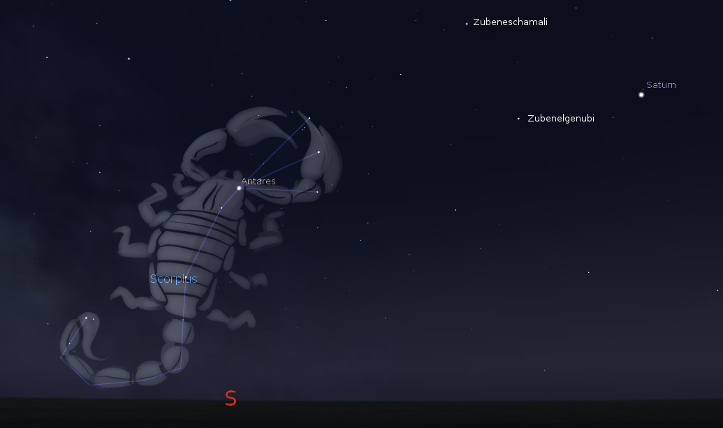 Scorpius at 11 p.m. on July 9, 2013. Credit Stellarium. I don’t agree with the artist’s drawing of the scorpion. To me it’s larger. The arc of three stars in the drawing’s right claw to me is its head and start of the claw appendages. I’ve added two star names from the constellation of Libra to the right. The Arabic translation of Zubeneschamali and Zubenelgenubi is North Claw and South Claw respectively. At one time Scorpius was larger than it is depicted today. Click on the image to enlarge.