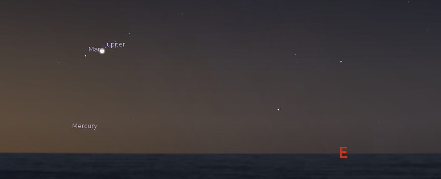 Jupiter, Mars and Mercury in morning twilight at 5:20 a.m. on July 25, 2013. I didn’t mention Mercury on the program because it’s very difficult to spot. Created using Stellarium.