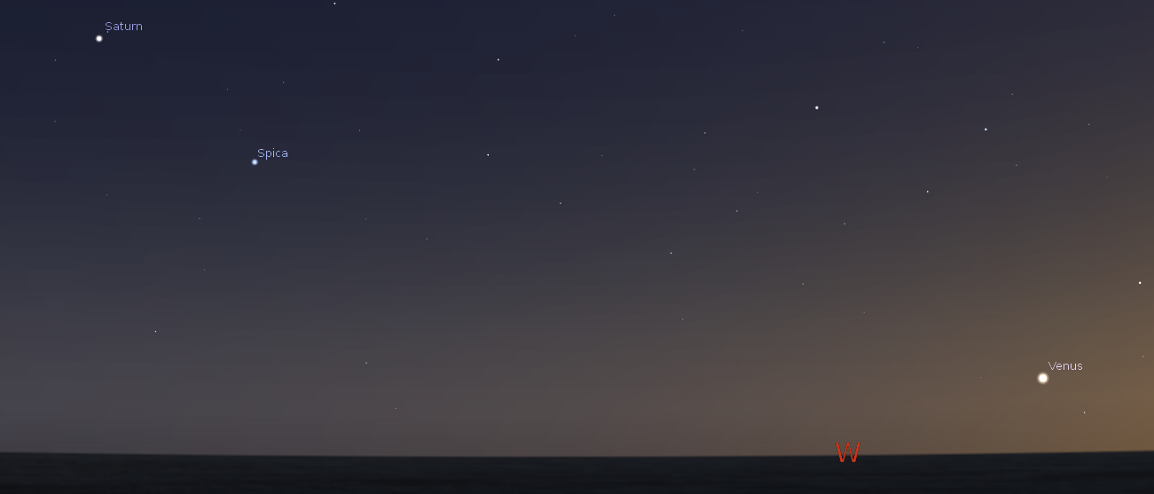 Lets check out the planets visible now. Venus is now low in the west northwestern sky in evening twilight, Venus will set at 10:44 p.m. Holding forth in the southwest will be Saturn this evening, the brightest star-like object in the constellation Virgo appearing yellowish to the left of the extremely blue-white star Spica. Saturn is a wonderful sight in a telescope of 20 power or more. In telescopes Saturn’s large moon Titan can be easily seen. Saturn will set at 1:04 tomorrow morning. Jupiter and Mars will rise close together at 4:14 and 4:17 a.m. Respectively in the east northeast in morning twilight. The much dimmer Mars will appear to the lower left of the brighter Jupiter, and may take binoculars to locate.