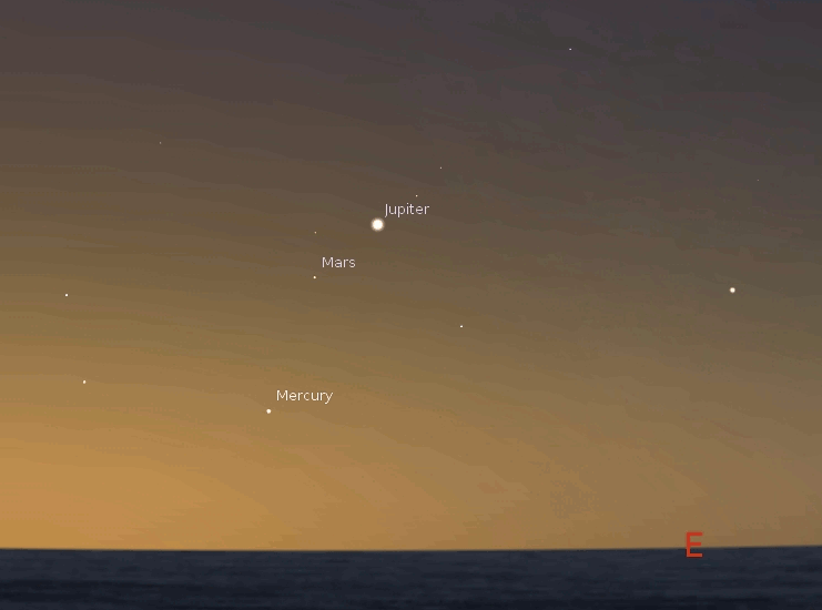 Animation of Mercury, Mars and Jupiter at one day intervals from July 31 to August 7, 2013 at 5:45 a.m. Created using Stellarium and the GIMP.