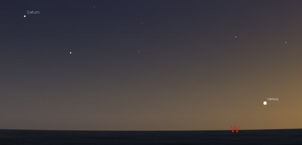 Lets check out the planets visible now. Venus is now low in the west northwestern sky in evening twilight, Venus will set at 10:44 p.m. Holding forth in the southwest will be Saturn this evening, the brightest star-like object in the constellation Virgo appearing yellowish to the left of the extremely blue-white star Spica. Saturn is a wonderful sight in a telescope of 20 power or more. In telescopes Saturn’s large moon Titan can be easily seen. Saturn will set at 1:04 tomorrow morning. Jupiter and Mars will rise close together at 4:14 and 4:17 a.m. Respectively in the east northeast in morning twilight. The much dimmer Mars will appear to the lower left of the brighter Jupiter, and may take binoculars to locate.