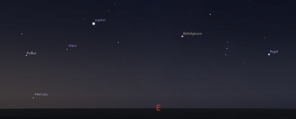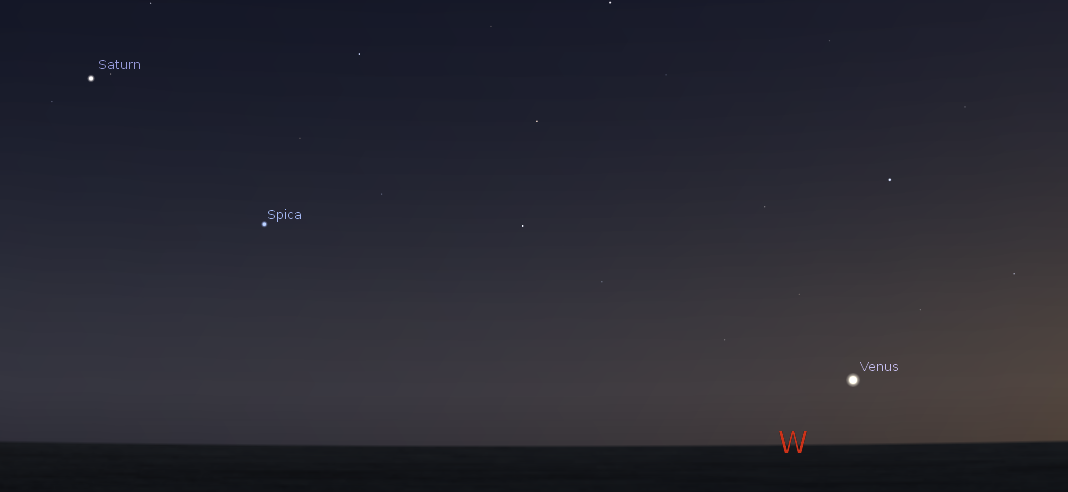 Lets check out the planets visible now. Venus is now brilliant low in the western sky in evening twilight, It will set at 10:23 p.m. Holding forth in the southwest will be Saturn this evening, the brightest star-like object in the constellation Virgo appearing yellowish to the left of the extremely blue-white star Spica. It will set at 12:14 tomorrow morning. In the morning sky before sunrise Jupiter will rise at 3:33, with Mars rising shortly after at 4:06, which will appear below and left of Jupiter by four and a half degrees or half the width of your fist held at arm’s length. Mercury will rise at 5:12 a.m. tomorrow. It will nearly two widths of your fist below and left of Jupiter. For sharp-eyed observers we have 5 planets visible now.