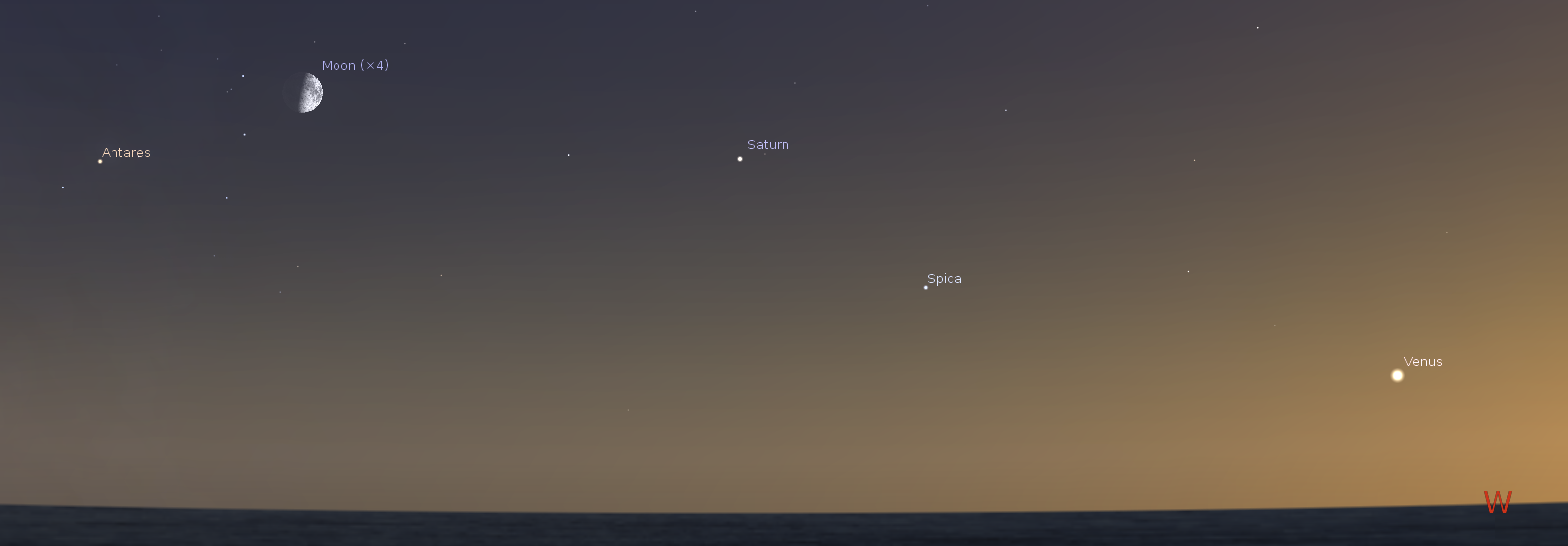 Lets check out the planets visible now. Venus is now brilliant low in the western sky in evening twilight, It will set at 10:23 p.m. Holding forth in the southwest will be Saturn this evening, the brightest star-like object in the constellation Virgo appearing yellowish to the left of the extremely blue-white star Spica. It will set at 12:14 tomorrow morning. In the morning sky before sunrise Jupiter will rise at 3:33, with Mars rising shortly after at 4:06, which will appear below and left of Jupiter by four and a half degrees or half the width of your fist held at arm’s length. Mercury will rise at 5:12 a.m. tomorrow. It will nearly two widths of your fist below and left of Jupiter. For sharp-eyed observers we have 5 planets visible now.