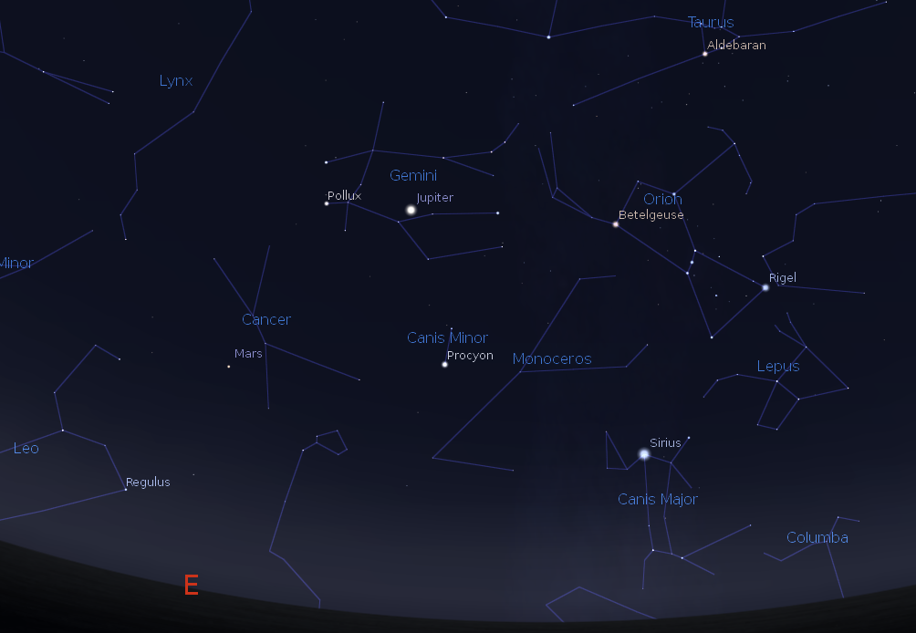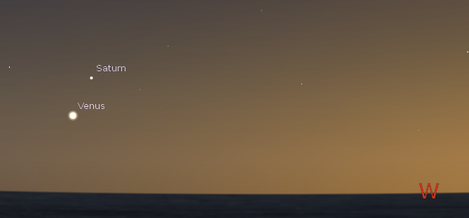 Time again to check out the bright planets. Saturn and Venus will be closest together tonight, low in the southwest after sunset. Dimmer Saturn will be on top. Binoculars may be needed to spot it. Venus will set at 9:13 p.m., while Saturn will set at 9:32. We will soon lose Saturn in the sun’s glare for a few months. The rest of the planetary action will be in the morning sky. The giant planet Jupiter will rise at 1:22 a.m. in the east northeast. It’s cruising against the stars of Gemini this viewing season. By 6 a.m it will be high in the east southeast, the brightest object in that direction. Mars will rise at 3:39 a.m. also in then east northeast. It is a bright reddish second magnitude star passing through Cancer now.