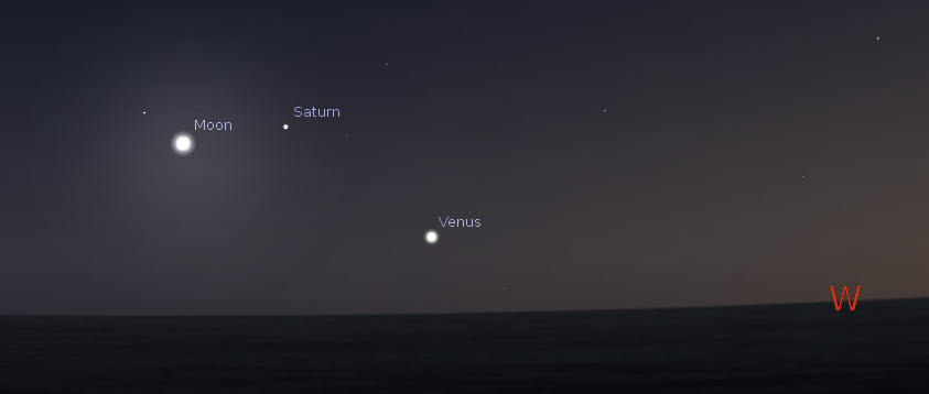 The Moon will pass Saturn around noon today. By 9 p.m. the Moon will have scooted to the left of Saturn by 10 of its widths or half the width of your fist held at arm’s length. We are getting to the point that Saturn’s image is being seriously degraded in telescopes because the planet is so close to the horizon and we are looking at it through the very thick atmosphere. The Moon however is getting better each night and it moves higher each night. In binoculars the young Moon will reveal two dark seas. Above is the distinctive Sea of Crises, and below the Sea of Fertility. The Sea of Tranquility is partially illuminated, now cut by the Moon’s terminator or sunrise line. Telescopes will reveal interesting features near there.