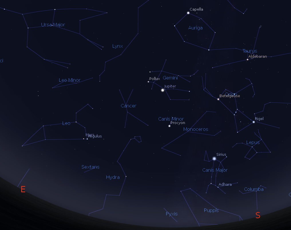 Jupiter and Mars with the winter stars and constellations at 6 a.m., October 17, 2013. Created using Stellarium.