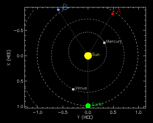 The current positions of the Earth, Sun and STEREO Ahead (A) and STEREO Behind (B) spacecraft. Credit NASA/STEREO.