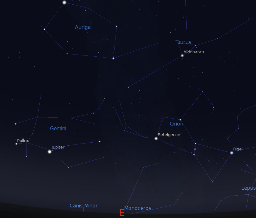 At 9 p.m. the constellation of Orion the giant hunter will be rising in the east southeast, with its belt stars nearly vertically aligned. The belt stars are contained within a tilted rectangle of four bright stars that’s leaning to the left. The brightest of the top stars is Betelgeuse a bright red star about the hue of the planet Mars. It’s a huge red giant star. Both top stars are Orion’s shoulders. The other shoulder star is Bellatrix. The bottom stars are Orion’s knees. The brightest, diagonally opposite from Betelgeuse is Rigel, a bright blue-white giant star. The other knee star is named Saiph. Orion is home to a beautiful nebula or cloud of gas, which we’ll explore later this winter. Jupiter is the bright stellar looking object to the left of Orion.
