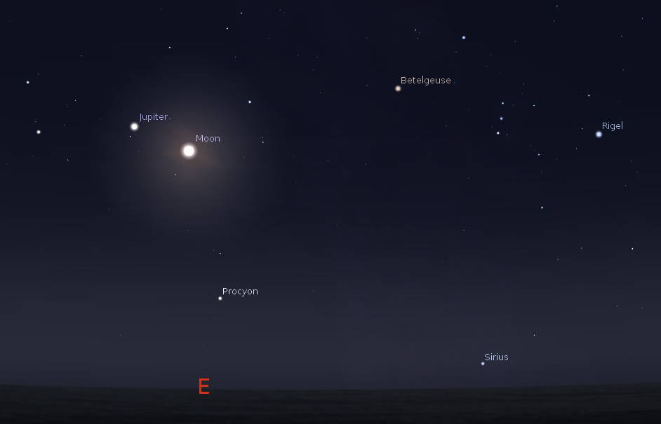 Jupiter and its moons as seen in a telescope at 9 p.m. December 18, 2013. The orientation may be rotated or even mirror image. Created using Stellarium.